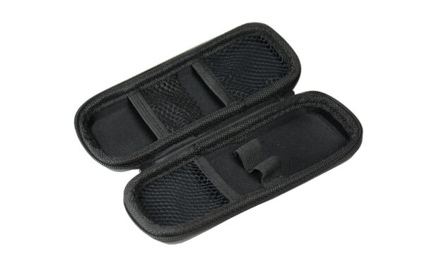 Stabiles Etui zum sicheren verstauen von E-Zigarette, Batterien, E-Liquid Flaschen und Zubehör. Es hat innen Gummibänder und Netze damit alles an seinem Platz bleibt und ist mit einem Reissverschluss verschliessbar.