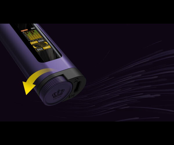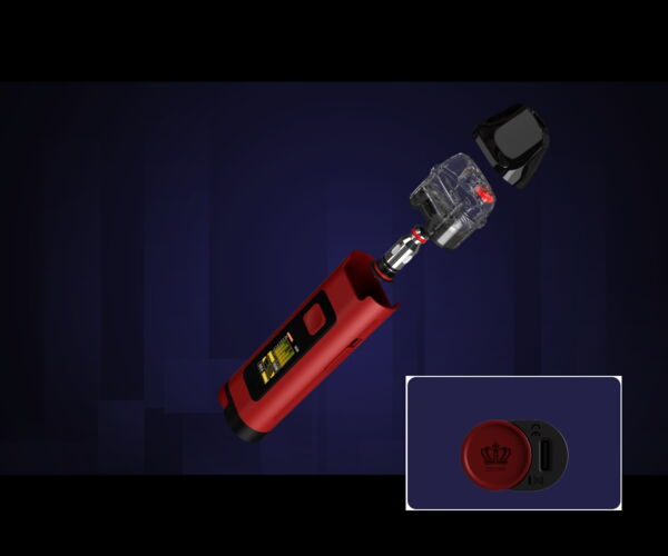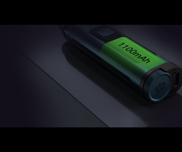 Der Akkuträger hat eine eingebaute 1100 mAh Batterie und eine Ausgabeleistung von 5 - 35 Watt. Am unteren Ende der E-Zigarette befindet sich ein USB-C Anschluss und der Drehregler. In der Mitte ein 0.96 Zoll OLED Farbdisplay und der Starterknopf. Der Crown D kann über den Starterknopf oder über die Zugautomatik ausgelöst werden. Seitlich befindet sich ein Schieberegler, mit dem der Zugwiderstand (Airflow) eingestellt werden kann.