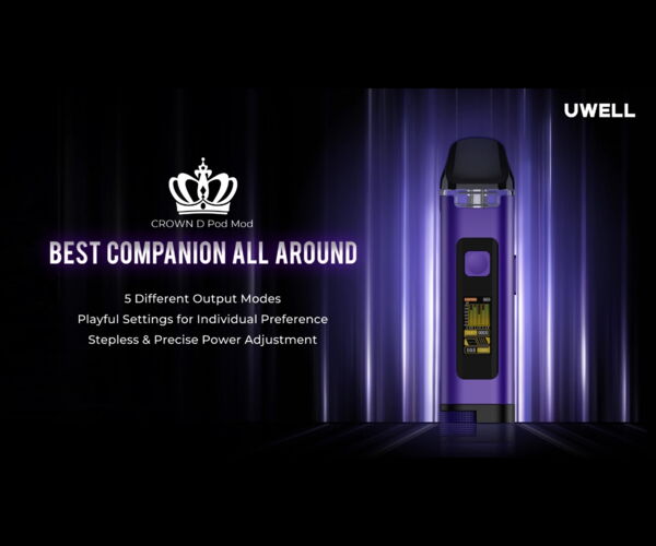 Das Pod-System Crown D von Uwell ist ein Grosser. Einerseits ist er etwas grösser als man von einem Pod-System erwartet jedoch leicht und kompakt. Andererseits hat er viele Möglichkeiten einer «grossen» E-Zigarette. So kann die Ausgangsleistung mit einem Drehregler eingestellt werden. Er verfügt über ein Farbdisplay. Er hat einen Starterknopf und eine Zugautomatik verbaut. Der Verdampfer/Pod ist magnetisch gesteckt, wie man dies auch von anderen Pod-Systeme her kennt und hat einen auswechselbaren Verdampferkopf (Coil). Insgesamt gesehen ein sehr starkes Gerät für diejenigen, denen ein Pod-System zu klein ist und eine grosse E-Zigarette zu wuchtig.