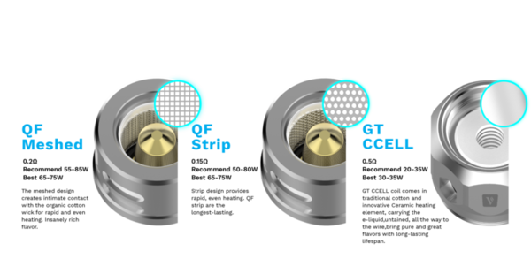 Vaporesso geht mit den QF Verdampferköpfe neue Wege. Einerseits sorgt das Gitternetz für einen grossen Luftzug und grosse Dampfwolken. Andererseits verwenden sie eine Mischung aus Flachs und Baumwolle, was für einen konstanten Geschmack und eine lange Lebensdauer des Verdampferkpfes sorgt.